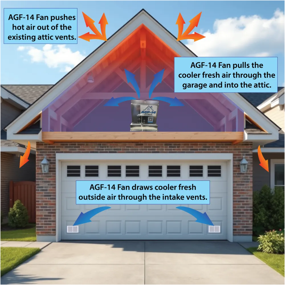- AGF-14: Ideal for homes with an attic above the garage. Designed to remove the heat trap from both your attic and garage.